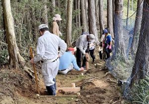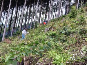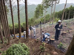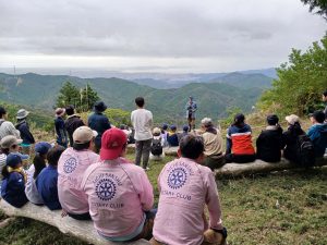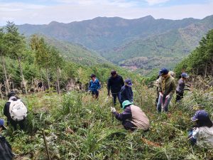 10/18に天使の森山づくりボランティアが開催されました。小原木材社員や他企業の方、ボーイスカウトの方、一般参加者の方など、約70名が参加しました。当日は過去の植樹地の下草刈り、山頂への道づくり、11/3に開催される植樹のためのネット張り、目印の杭打ちなどを行いました。山頂で昼食をとった後は意見交換会が行われ、午後からは引き続き森林整備の作業を行いました。